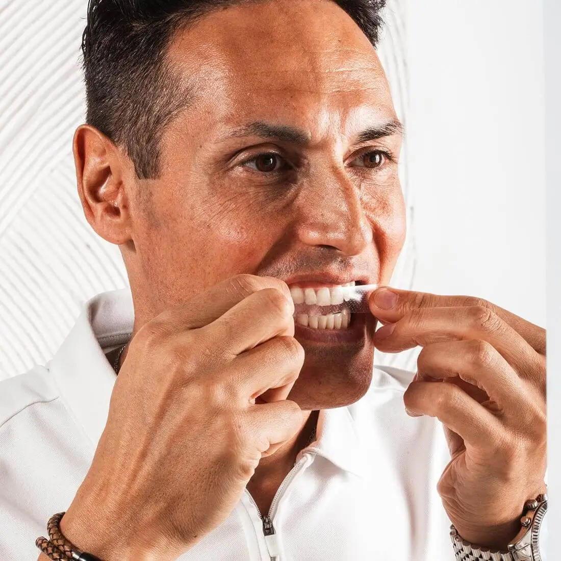 Apply the whitening strips to your teeth. Ensure teeth are clean and dry before whitening.