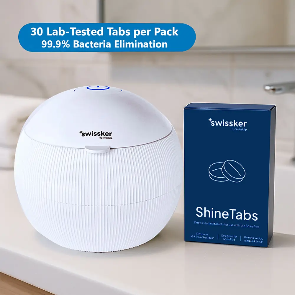 Refills for the dental cleaning ShinePod (Pack of 30). Remove the odor, plaque, and tartar on your dentures, aligner, mouthguard, or other dental appliances. Simply add the ShineTabs to your ShinePod for a deeper, more refreshing clean. Independently tested and shown to kill 99.9% of bacteria.