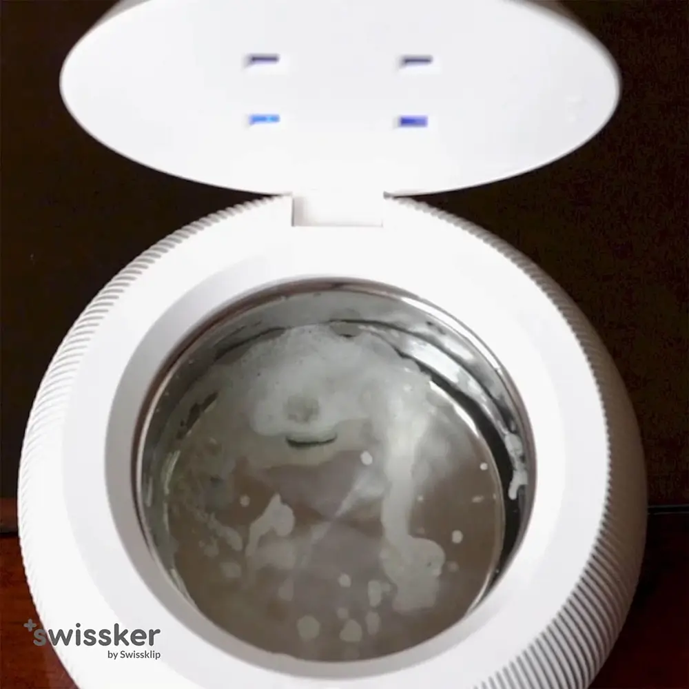 ShinePod is an ultrasonic retainer cleaner that uses a 42k hz vibration and UVC light to remove debris and kill up to 99.9% of germs and bacteria. Fill the ShinePod with clean water, add your dental appliance, close the lid, press the power button and let it work. It’ll automatically turn off after 5 minutes.