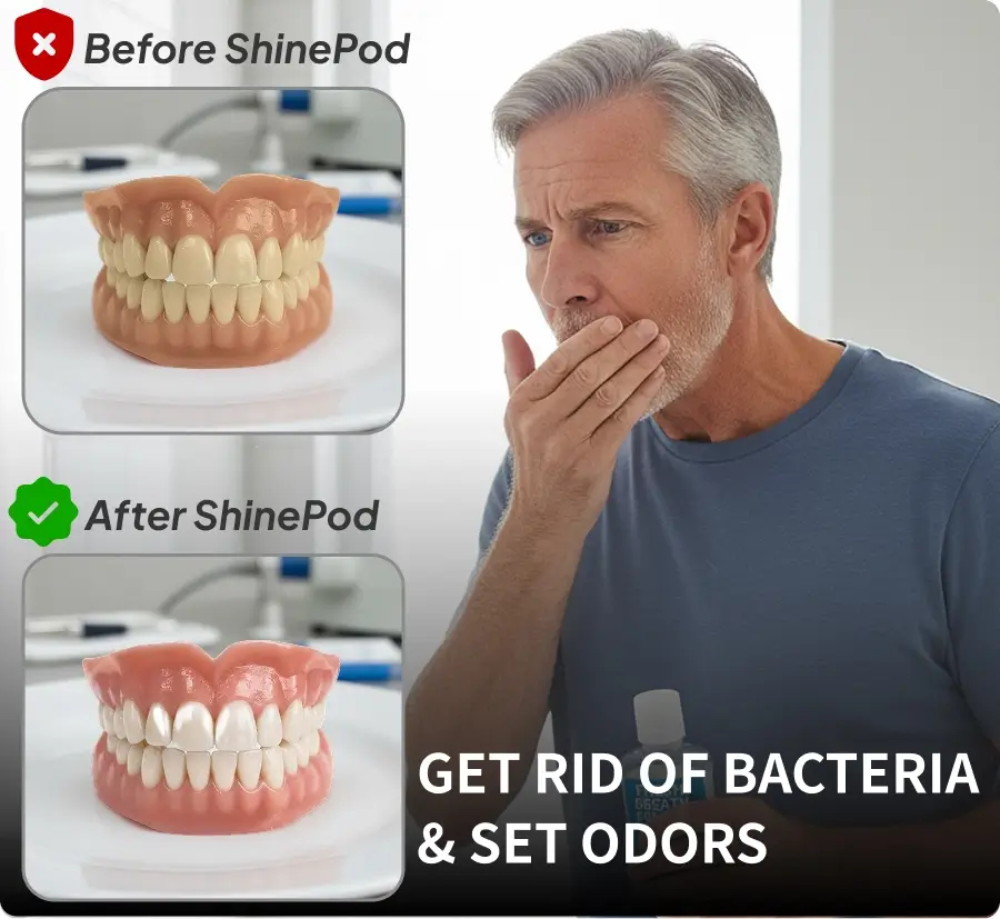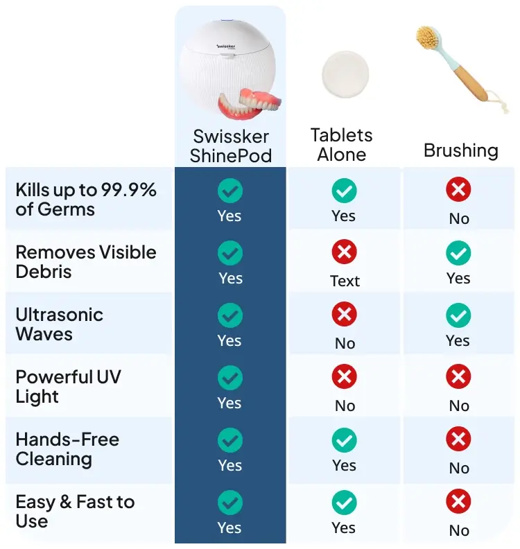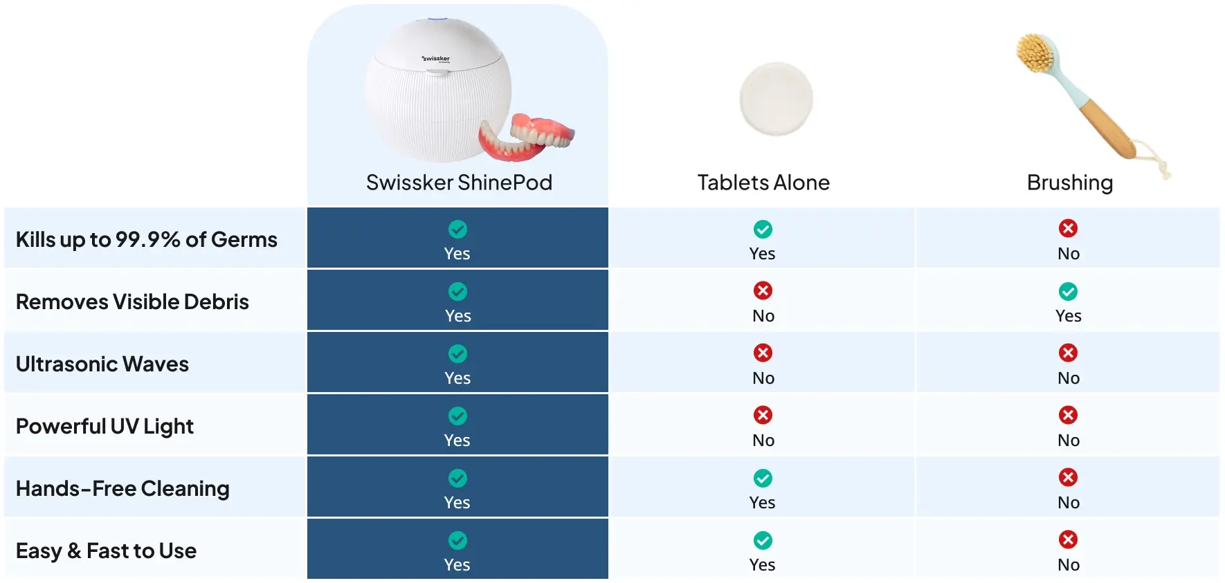 ShinePod is better than other denture cleaning devices because it has something extra: UV lights that sanitize your dentures and kill germs naturally.