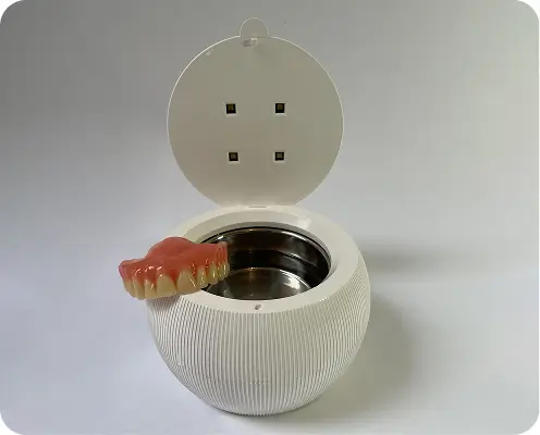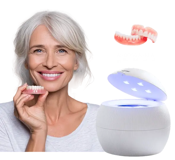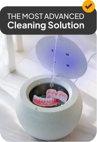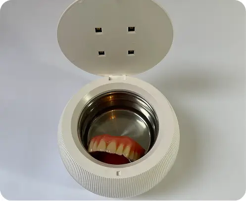 Simply push one button and walk away. Your dentures will be totally cleaned and refreshed with sanitizing UV light that kills germs and bacteria.