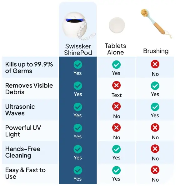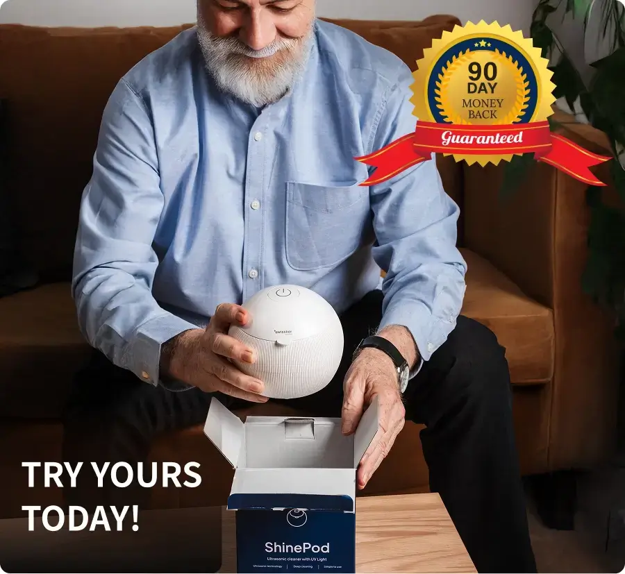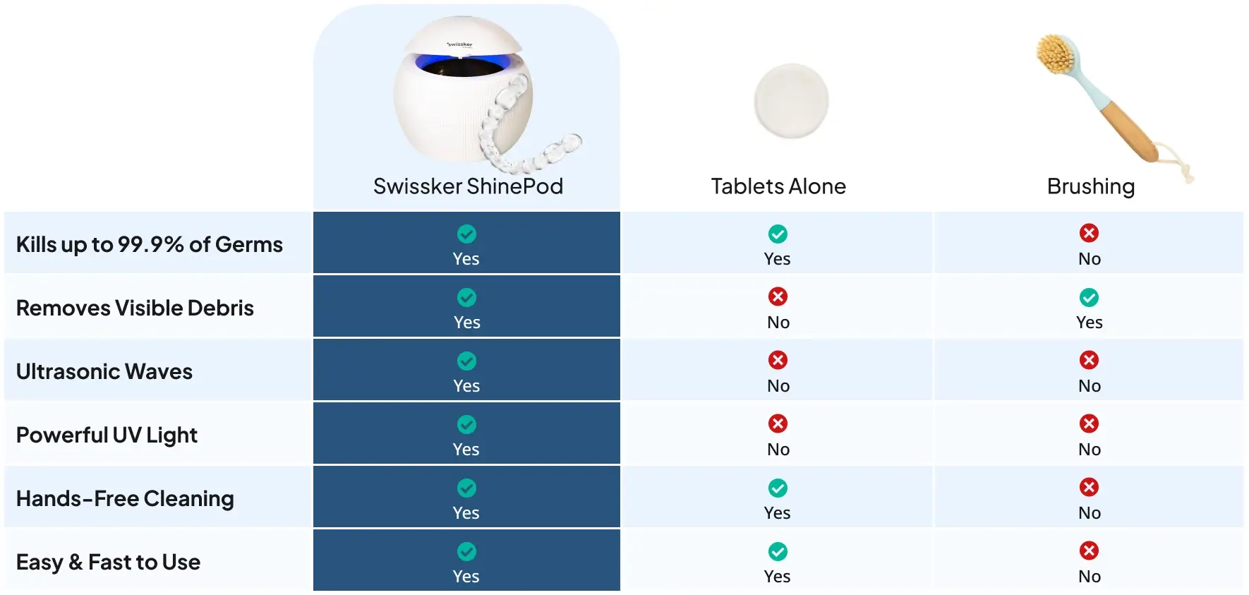 ShinePod kills germs that cause bad breath and purifies your dental appliance without the weird tasting chemicals from other cleaning products. In just a few minutes, your mouth will feel completely clean and refreshed.