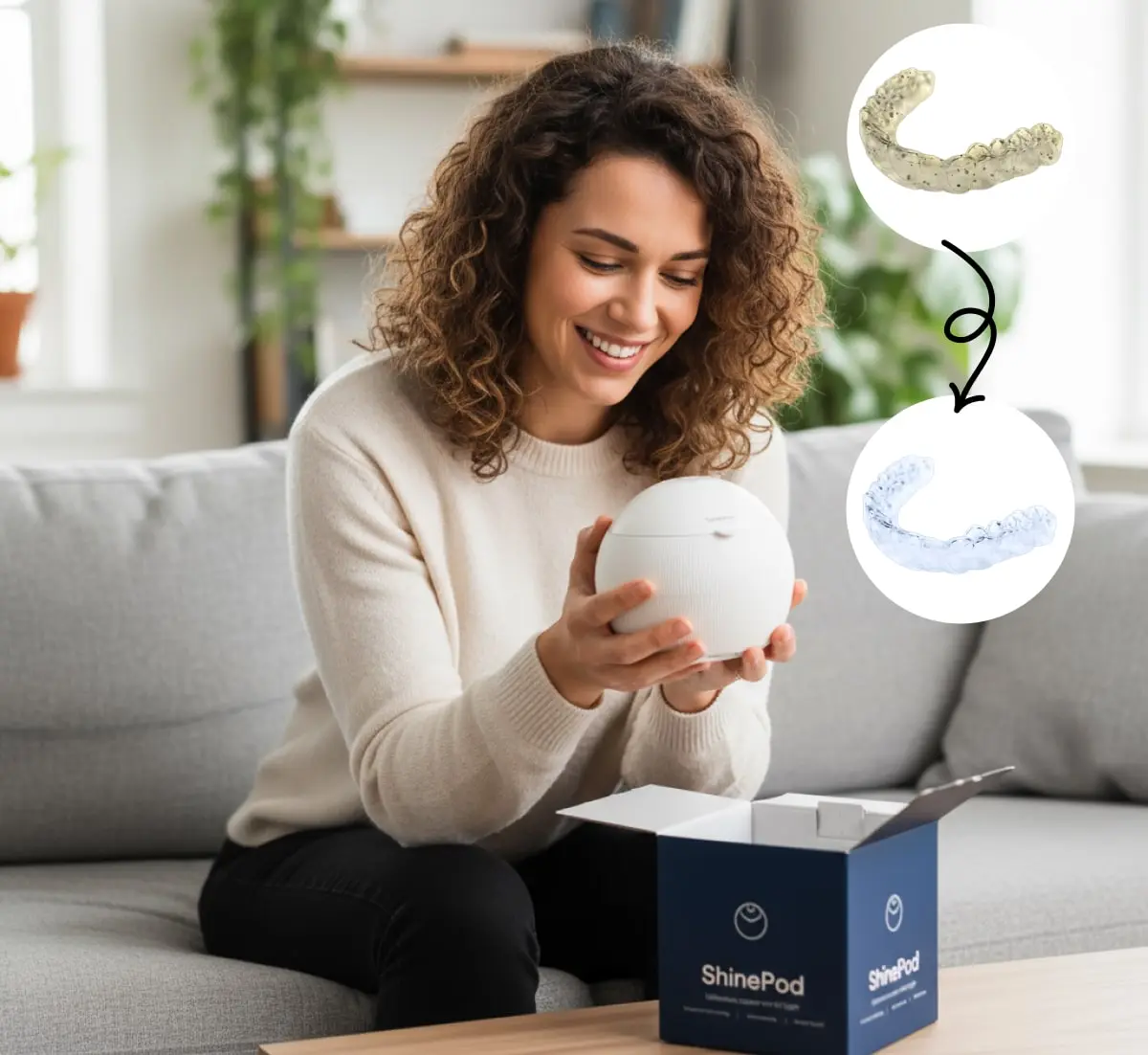 ShinePod physically destroys stains and kills the germs that might be causing extra cloudiness, giving you a perfectly clear, invisible aligner with the push of a button.